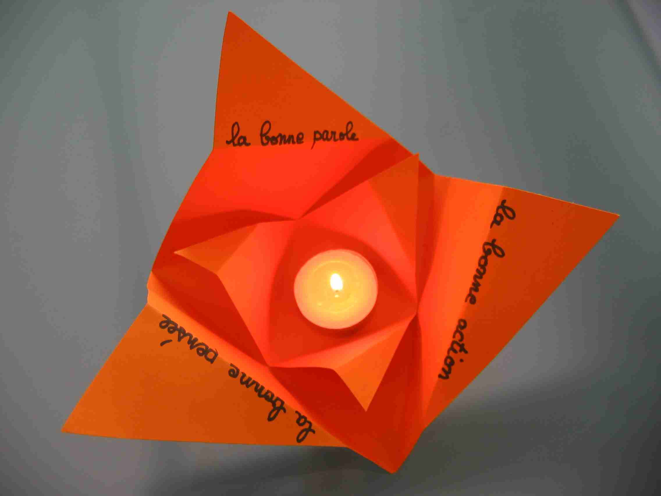 triangles (un grand, un petit) de papier cartonné orange et une bougie.
